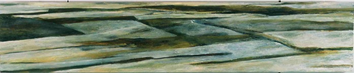 This painting maps a section of the Somme River through the battle-scarred land where the French and Commonwealth sectors joined. Names of the dead, taken from the tiny Hem Farm Monacu Military Cemetery are the foundation of the painting.