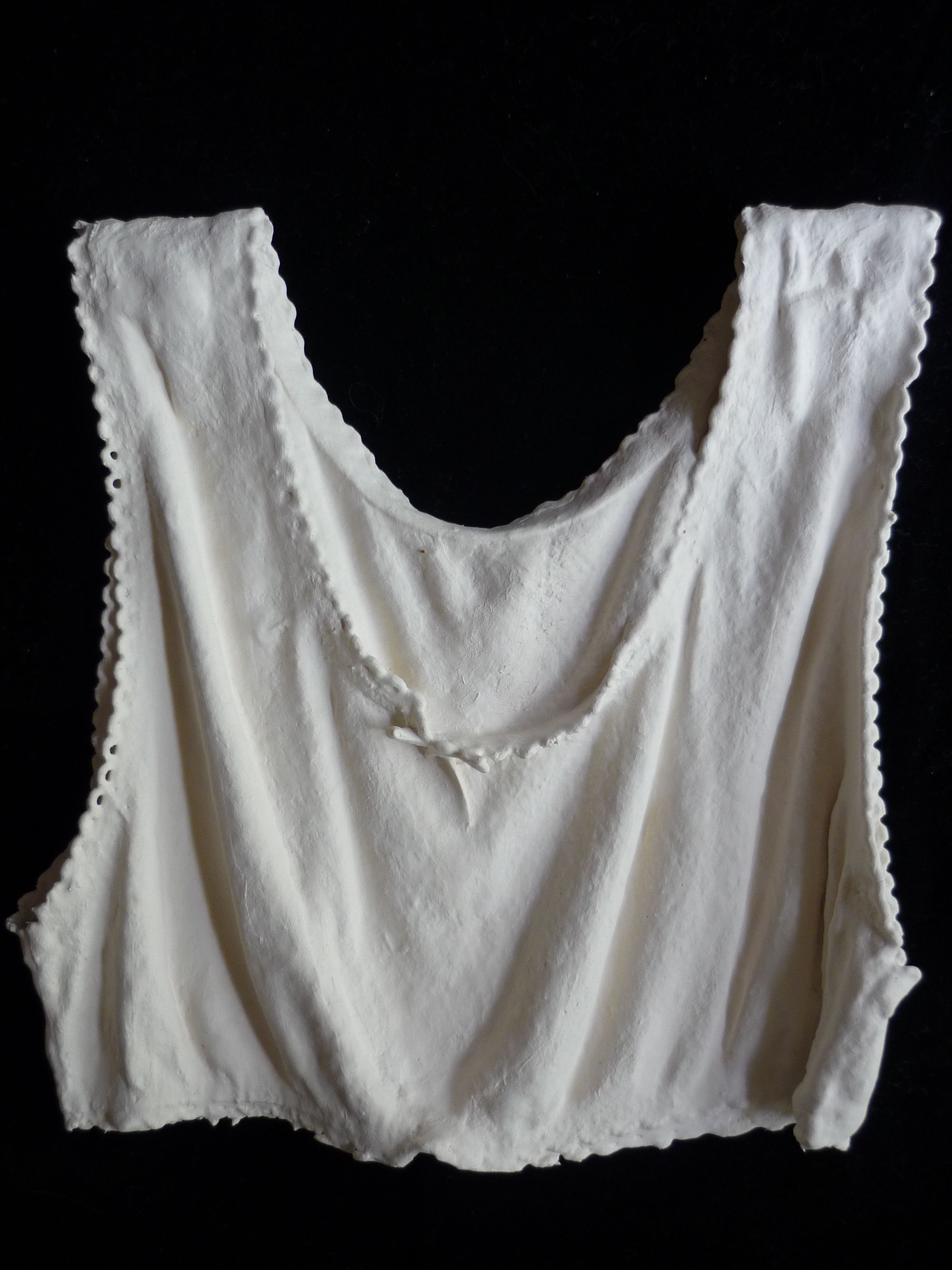 Explores the vulnerability of the child. The treatment of the children’s clothes is with clay slip/paper pulp. As with the other artworks using this material, the object and paper burn away, leaving a thin and fragile clay shell. Here in the careful attention given to the form of the garments and the retention of the integrity of the fabric, the memory of the body is embedded, the ghostly remains of innocence, of a lost childhood.