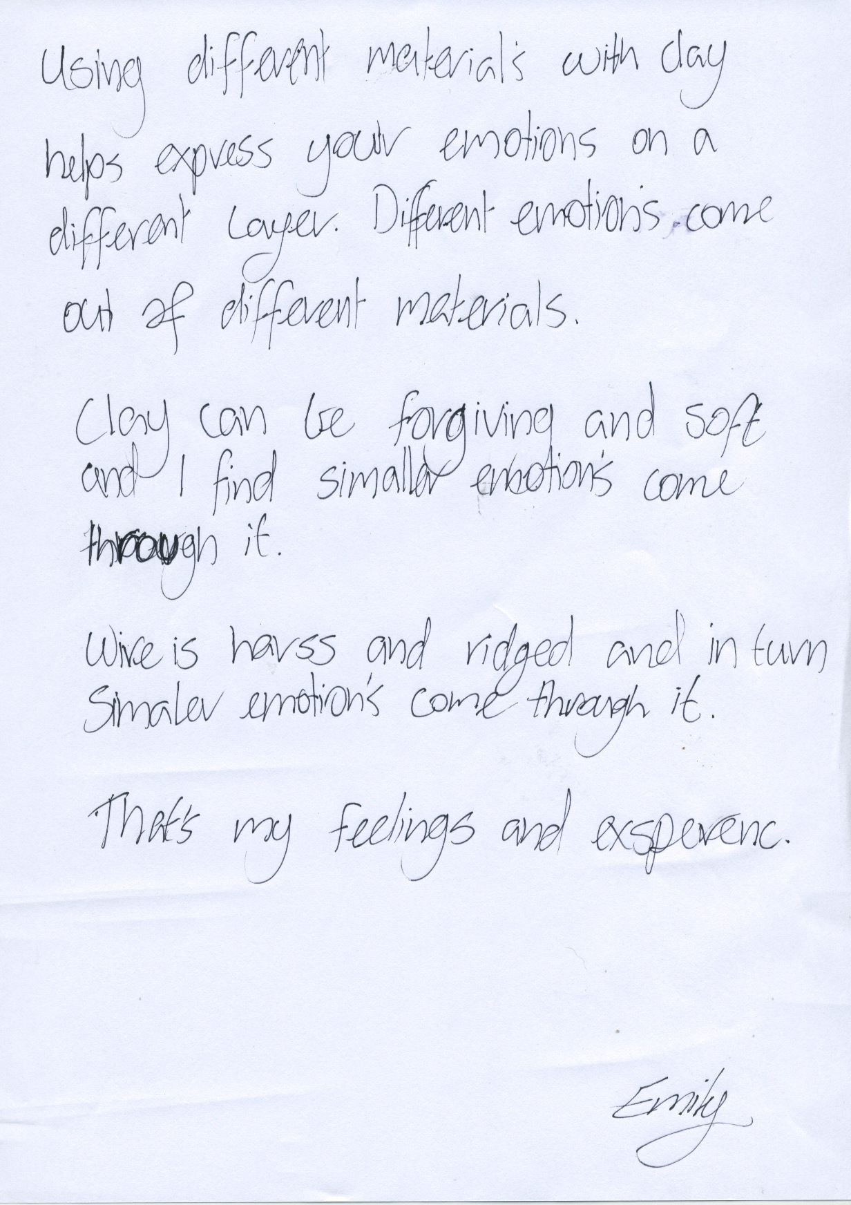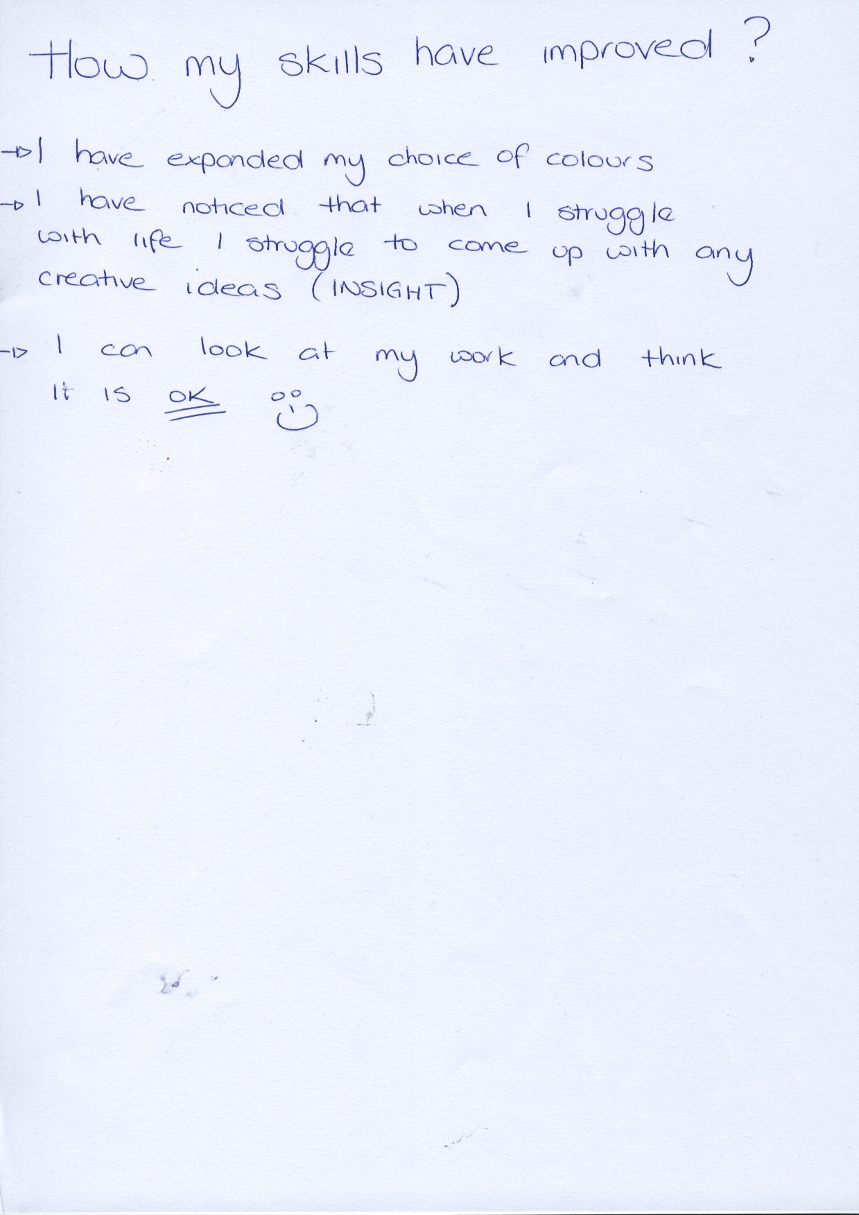 “I am glad I made the effort to come today. I enjoyed doing one art today in a group instead of being alone. Everyone made me feel welcome. I was very quiet and reserved today – personal stuff that is upsetting.”