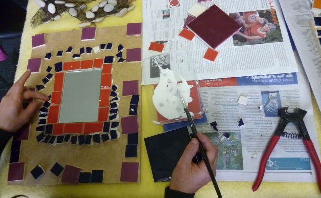 Glad. I enjoyed what I was doing today – like making the mirror. Disappointed that I won’t be able to make next week’s group and learn how to do the grout – oh well, I will learn it next time.”
