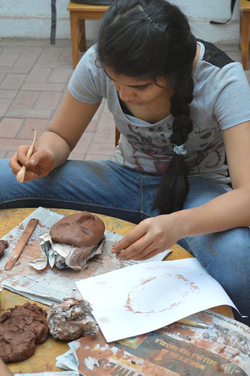 Ahmedabad, like all Indian cities, is incredibly noisy; traffic is constant, horns are blasting, people speak very loudly, and students seem to talk non-stop. It can be a difficult environment in which to create. I asked students to be as quiet as possible as they made their masks so that they could immerse themselves in the work, feel and see how the face holds the emotion, then put that into their artwork. They are a terrific group of young people, quite used to this request from me now and easily able to settle into focussed making.