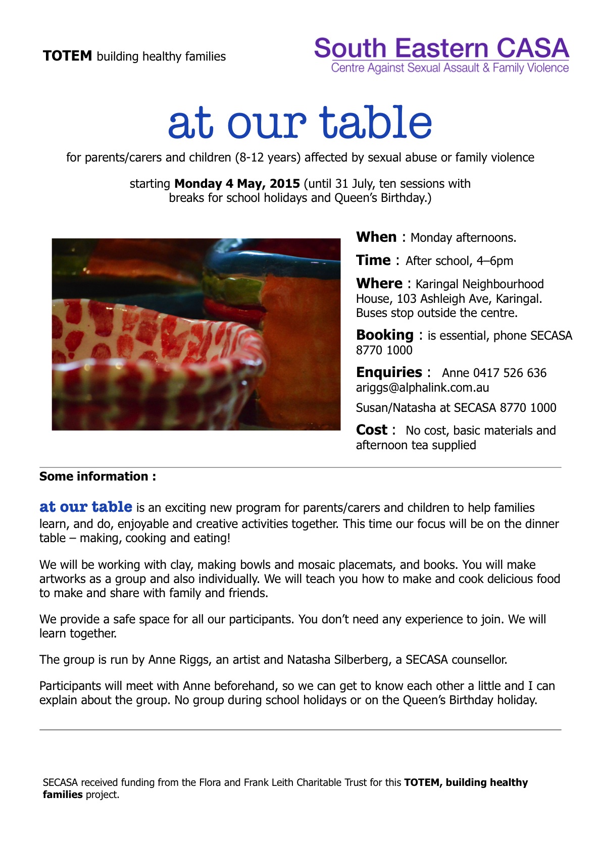 for parents/carers and children who have been affected by sexual abuse and family violence. Very excited about this new group – which combines art making and making delicious food to share. Parents and children will make bowls, placemats and other things for the table, as well as scrumptious food that you will love to make at home!