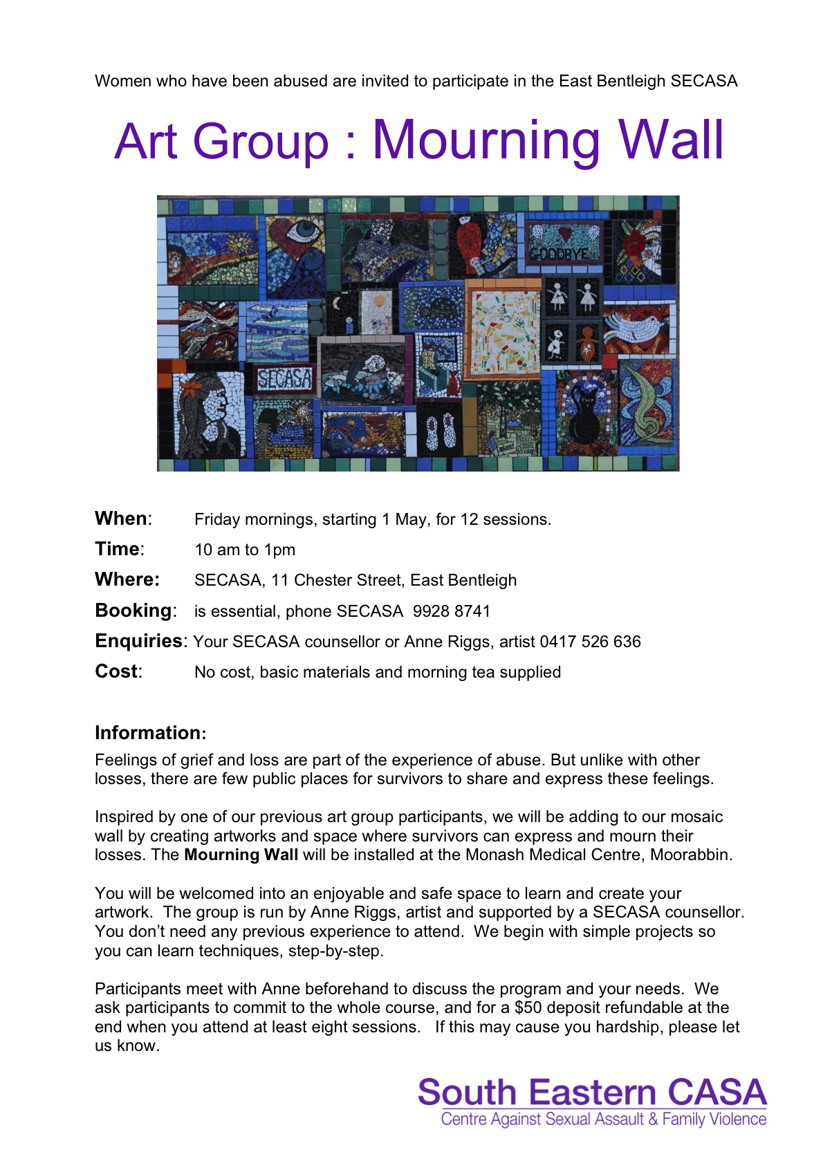 Melbourne readers may be interested in the following art groups for people who have been affected by sexual assault and / or family violence. If you are interested please contact either SECASA or me, as booking is essential for these groups.