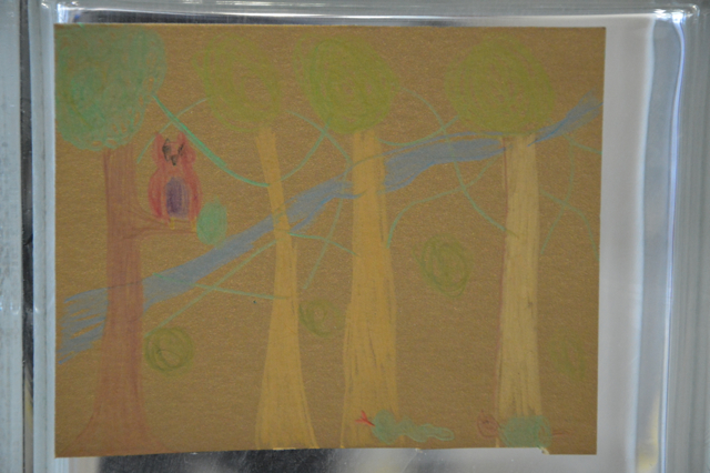 I spent quite a lot of time with the child who made this and many more cards (above). He could not go to school that day so he had come with his mother, who had cancer, and his father to the centre. Not easy for any of them – he was delighted to be at the art table and make and make and make and whilst the parents could devote themselves to meeting their appointments without overwhelming their child. This child also loved the natural environment and did lots of cards about trees and animals, he was delightful company for me and others at the table.