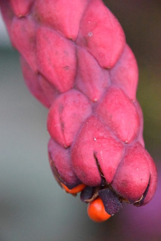 For the last few weeks I’ve been watching these strange flowers growing on a tree in a garden near our house. So pink. So plump and lumpy. Today I notice they are shedding their seeds. The orange – what a colour to pop out of the pink and purple.