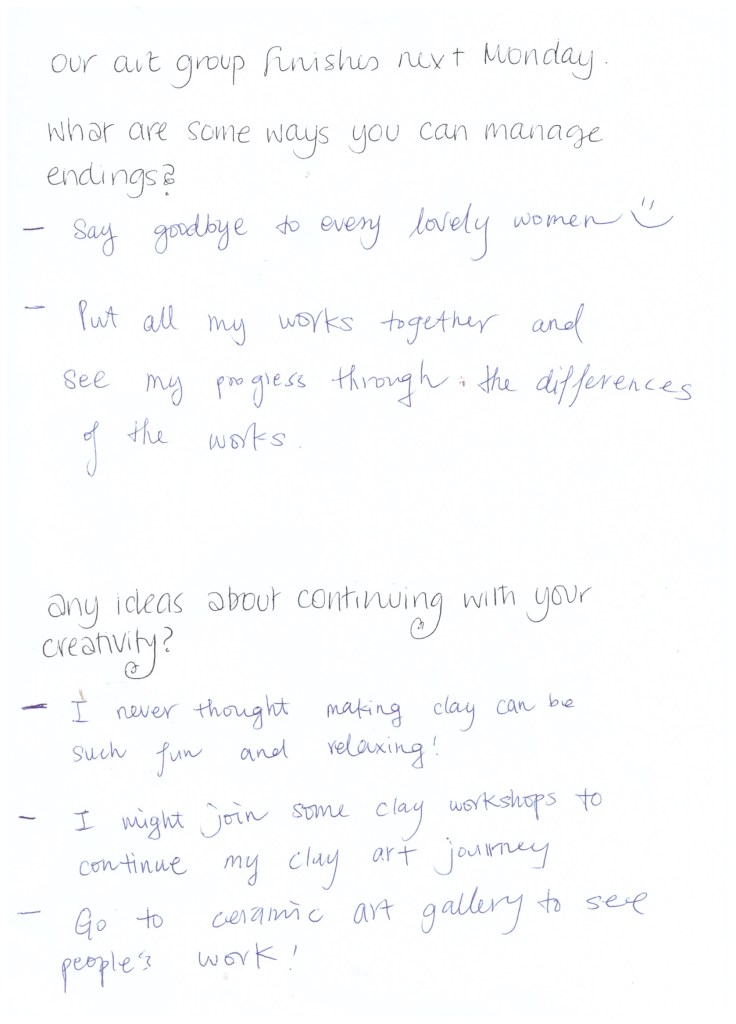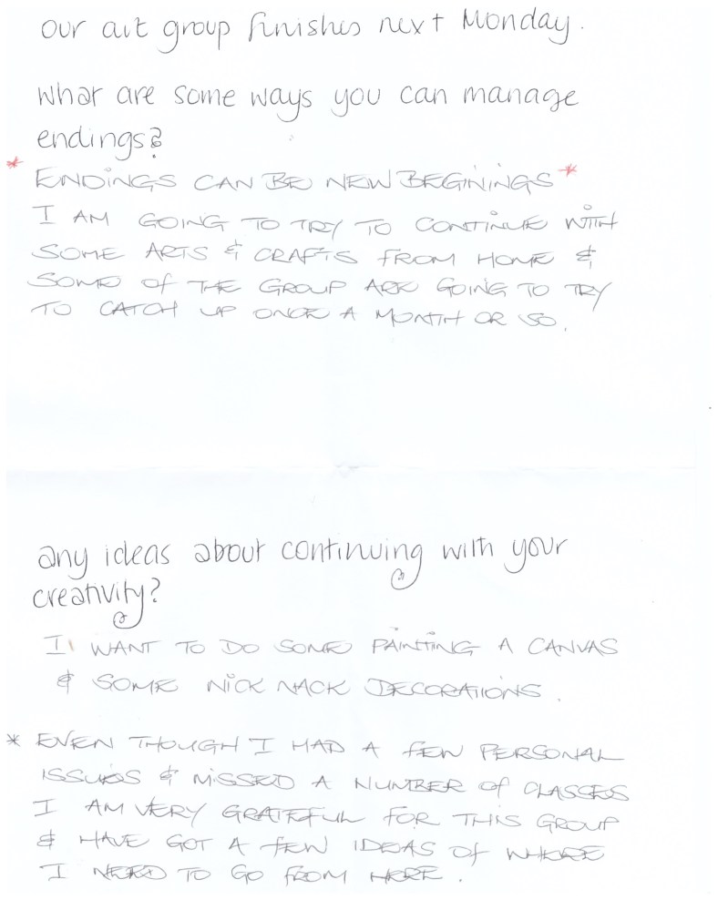 - They have always wanted to make art, or try working with mosaics, or clay. Many of our participants have been very badly treated by others, and their desires have not been met. Doing something that they have always wanted to do, and setting time aside to do it, can be an assertive thing to do, and a very positive step for people who have low self-confidence.
