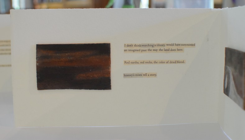 The text is re-purposed from a book I picked up by chance in Tasmania (The Shadow Catcher, Marianne Wiggins). I painstakingly cut out sentences and individual words and re-arranged them to meet my own purposes. I found Wiggins’ writing is often poetic and summons up similar emotions to my own work.