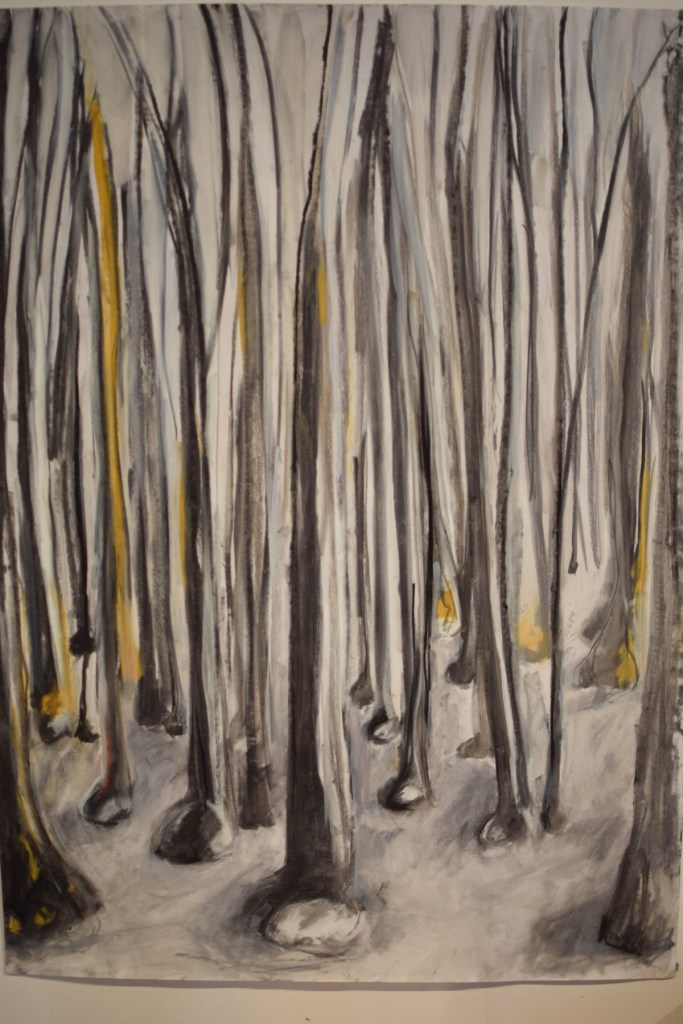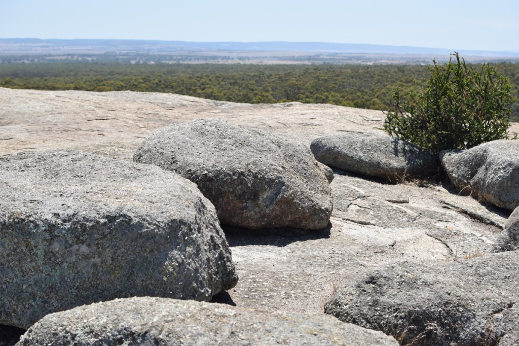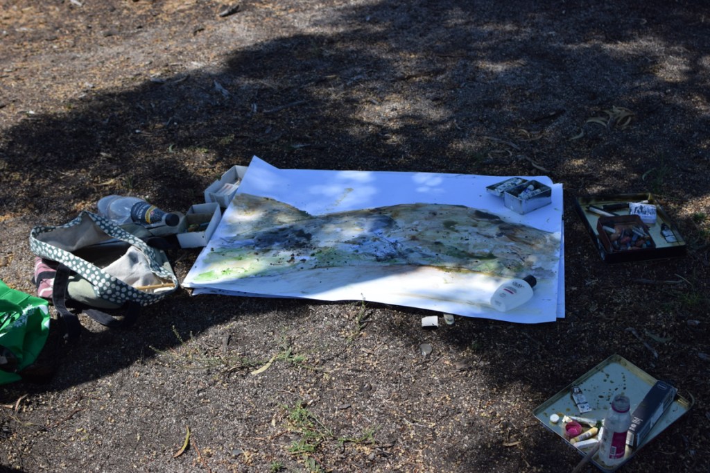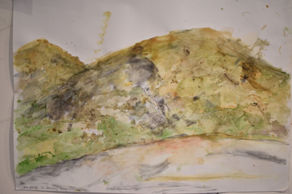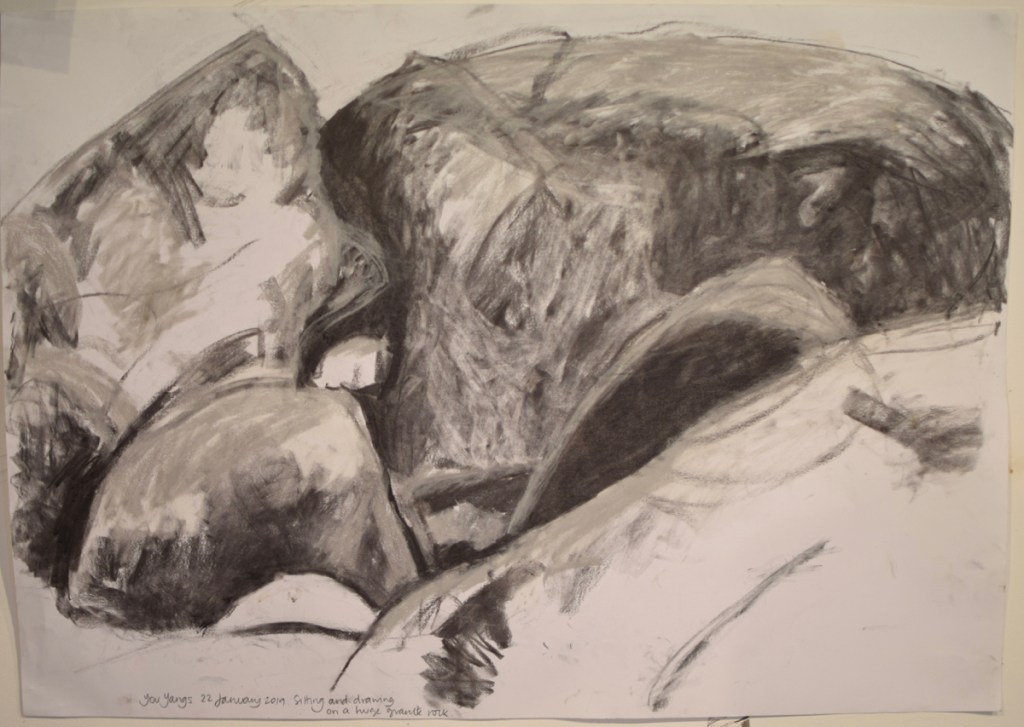 In this recent visit the You Yangs – a distinctive granite peaks of the You Yangs rise from the flat volcanic plains between Melbourne and Geelong (see Parks Victoria) I decided to draw large pictures cartridge paper, reasonably quickly and freely. I sat out on the leaf strewn ground, on huge rocks, under a tree and put marks on the page. I wanted to let nature impose itself into the drawings, so didn’t mind when a small breeze blew pools of watercolour and gravel across the page, or the rock I was sitting on pushed through into the drawing adding texture but not holes. I enjoyed the charcoal dust scattering everywhere – even where it was not particularly needed.