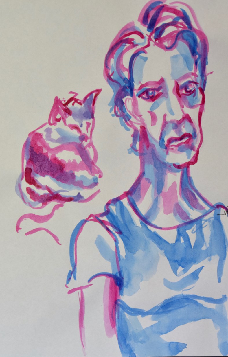 I love these drawings she did of me with my little cat – who uncharacteristically enjoys being present for this group.