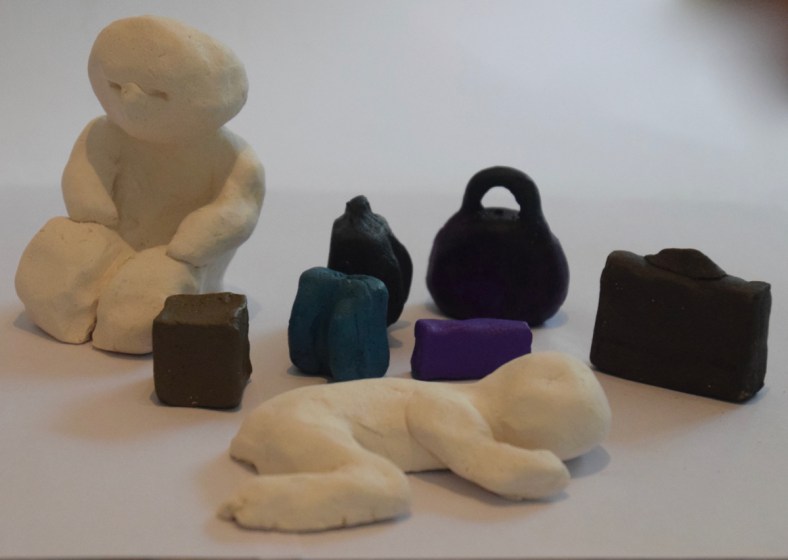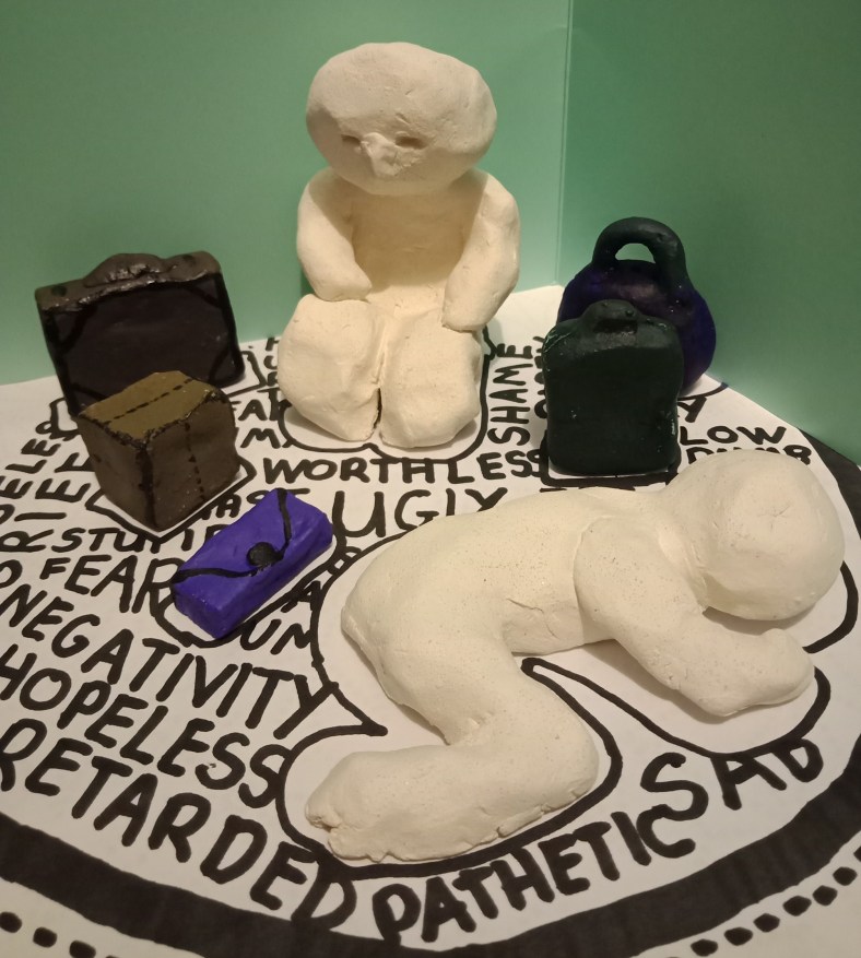 This powerful and heart breaking piece was created by Chantelle who was contemplating the baggage she carries. I took this photo in the studio; she took the work home and added to it.