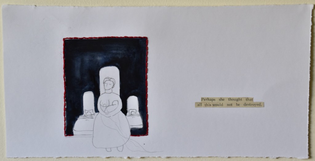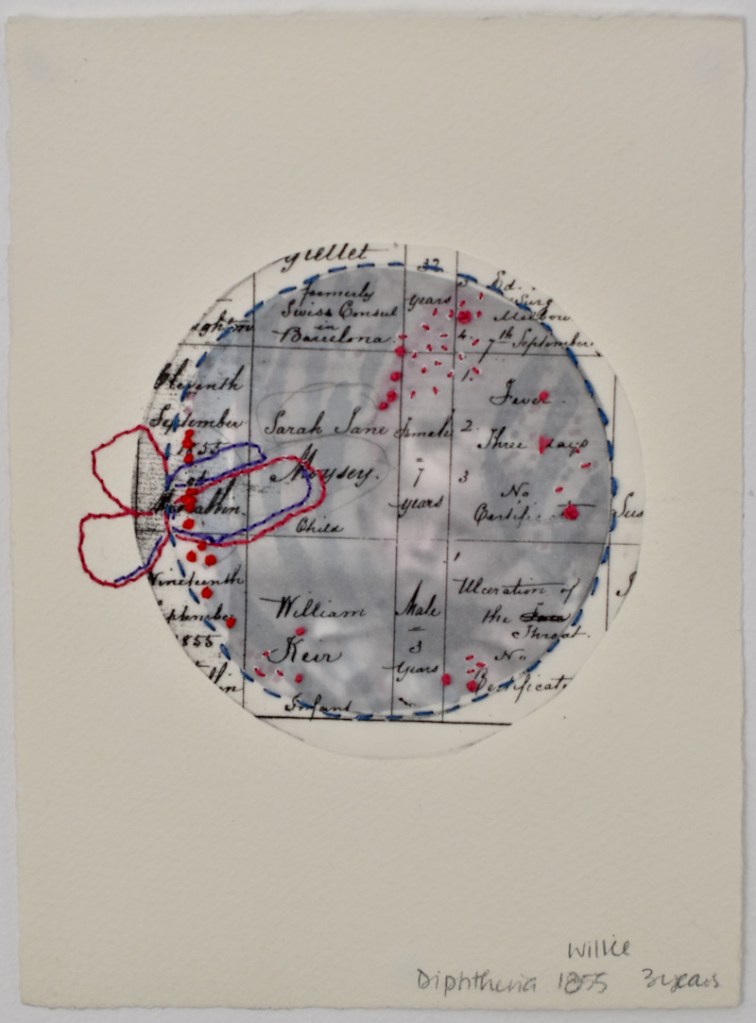 The two images above include the child’s death certificate, painted and sewn images of the disease with an image of a child. Many of the artworks I created for this project were also part of my project of creating an art work a day in 2020.