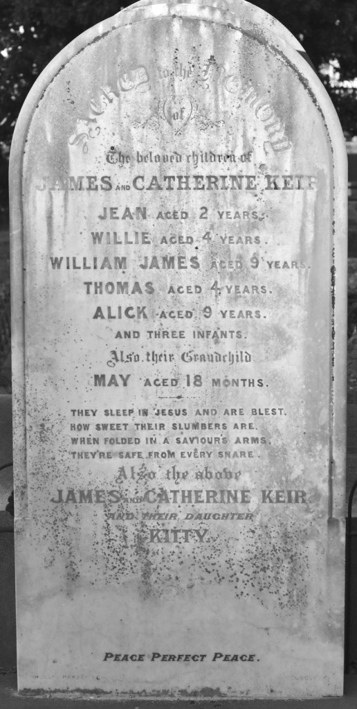 Catherine Small was 18 when she and 28 year old James Keir married; soon after they left Scotland for Australia. By then time she was 22 her first child, Elizabeth, had died in New South Wales. Australia was a new colony then, and records kept in churches rather than registered in the Department of Births Deaths and Marriages, the details of Elizabeth’s death remains an enigma to me. In her 1852 grief over the loss of her firstborn child, Catherine could not know that she would have to endure the deaths of seven more children, and at least ten grandchildren before she died in 1901.