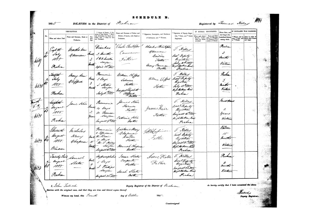 In 1855 the Cheltenham cemetery did not exist. Instead, these two little children, aged 3 and 2 (and their brother Thomas who was yet to be born in 1855) are buried in the St Kilda cemetery, in an unmarked grave.