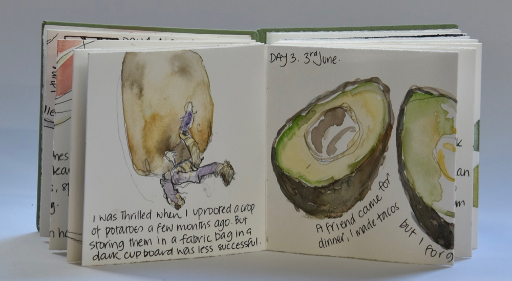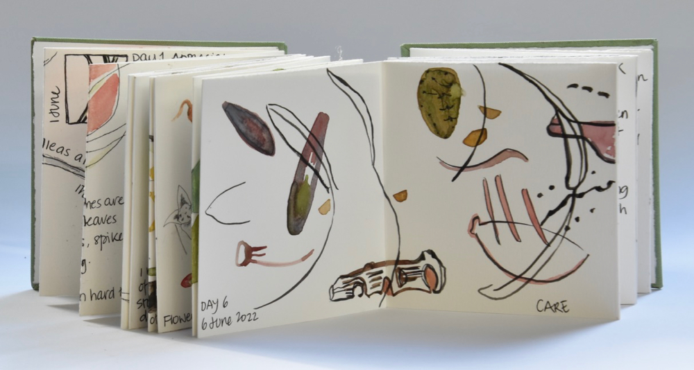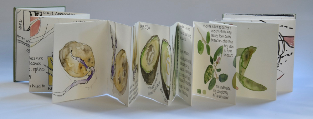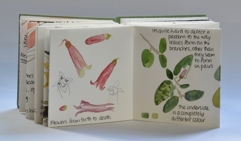 I began nature journaling during lockdown when Amy Diana ran monthly a on-line nature journal club. I love the combination of the visual arts with writing, memory, botany, the environment in any combination the maker desires. I have made dozens of small books, observing and noting the goings on in my garden and local environment. Sitting at my table at the end of the day with pencil, pen and watercolours, a little bit of the natural world which I have collected on a walk, an audio book and a cat or two nearby is bliss for me.