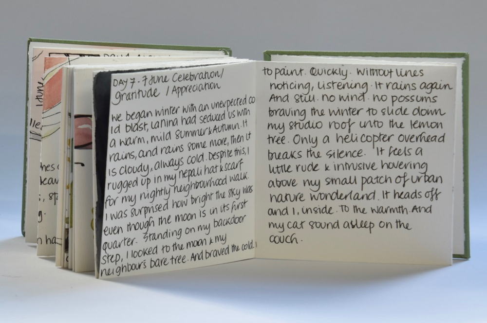 This is a concertina book I made during International Nature Journaling Week 2022. The week began on 1 June, the first day of our winter – and didn’t it come in with a blast! I have to admit to feeling envious of those in the northern hemisphere whose journals noted long days, vibrant gardens and lots and lots of goings on in their natural world. It was a lot starker in our winter gardens.
