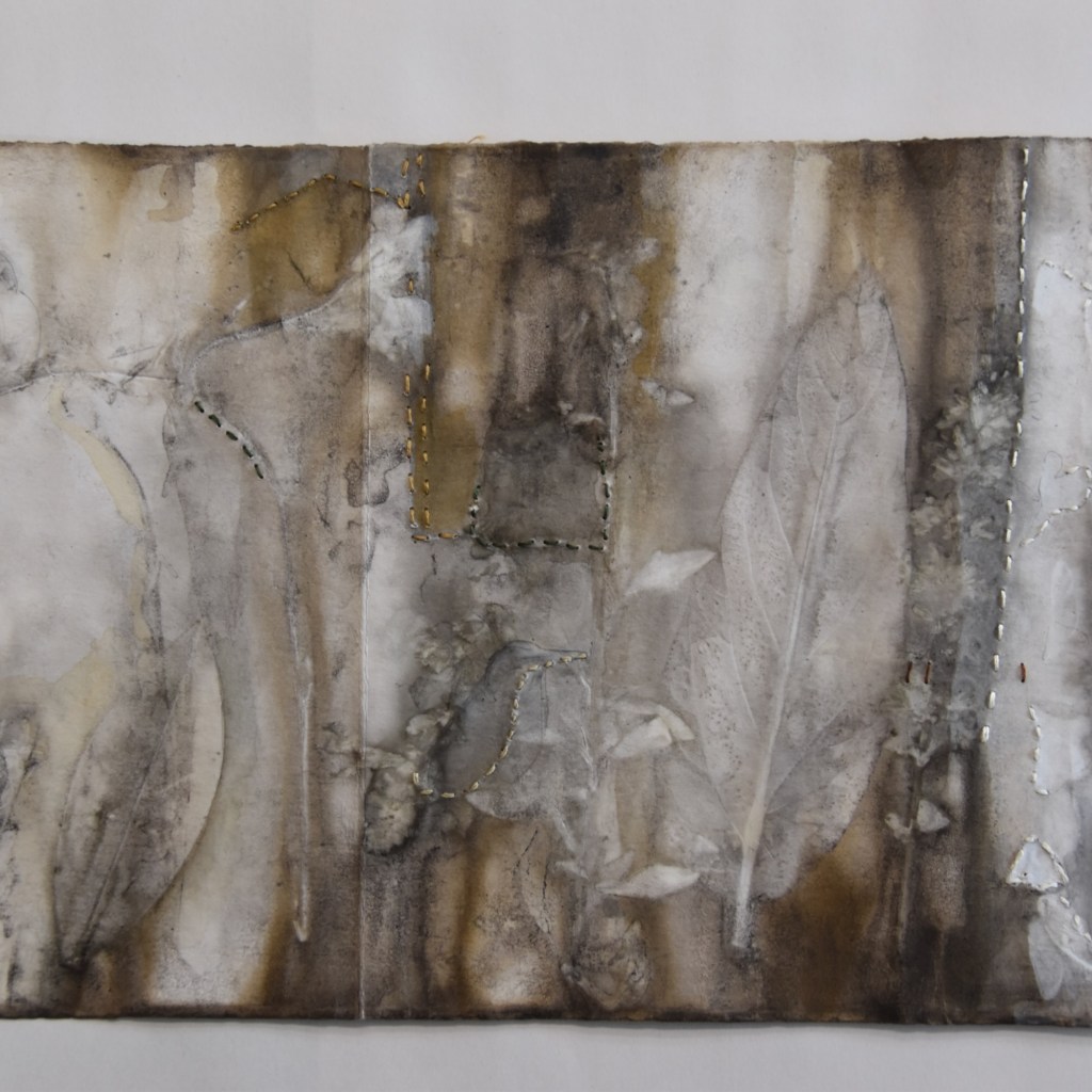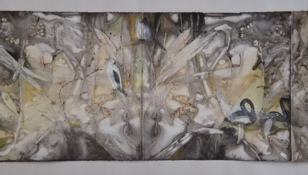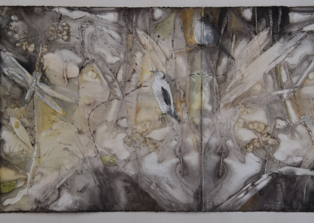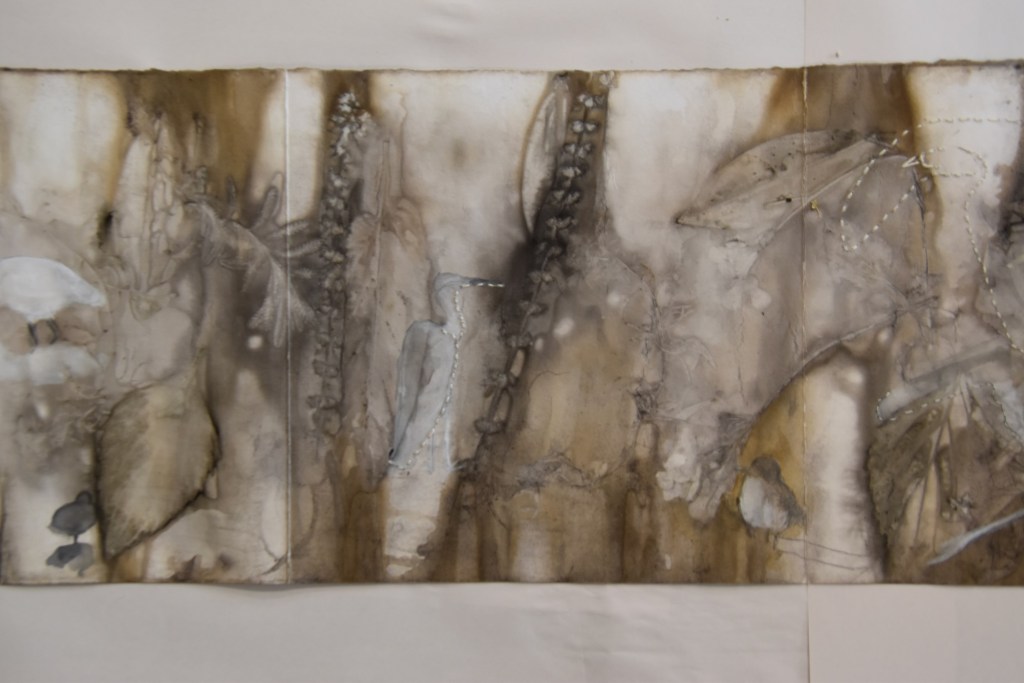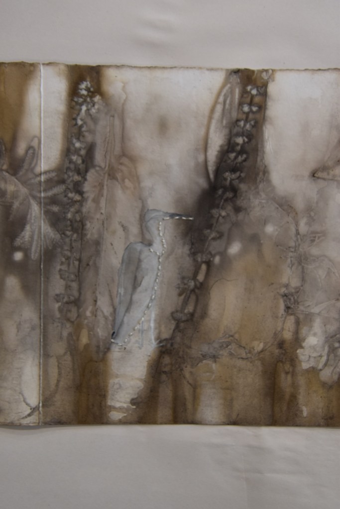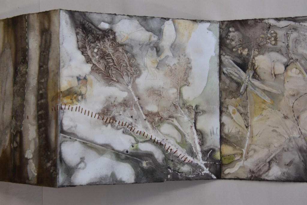 I returned to the wetlands a number of times during my long weekend stay and collected bits and pieces of plants to create this eco print on my return home. I used a heavy cartridge paper, which softened and tore a little in printing process. It’s fragility providing a metaphor for the vulnerability for a land that has been at times poorly treated. I added watercolour, images and thread to the concertina book to describe some of the journey of this beautiful environment.