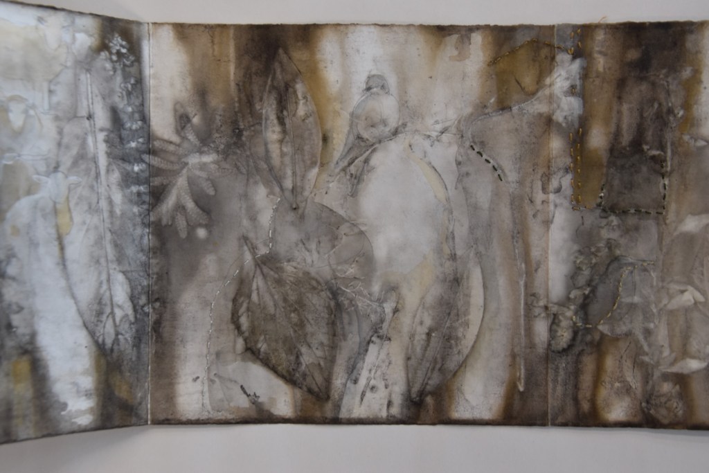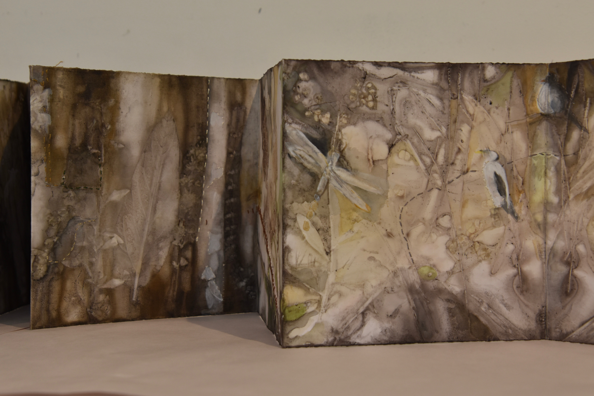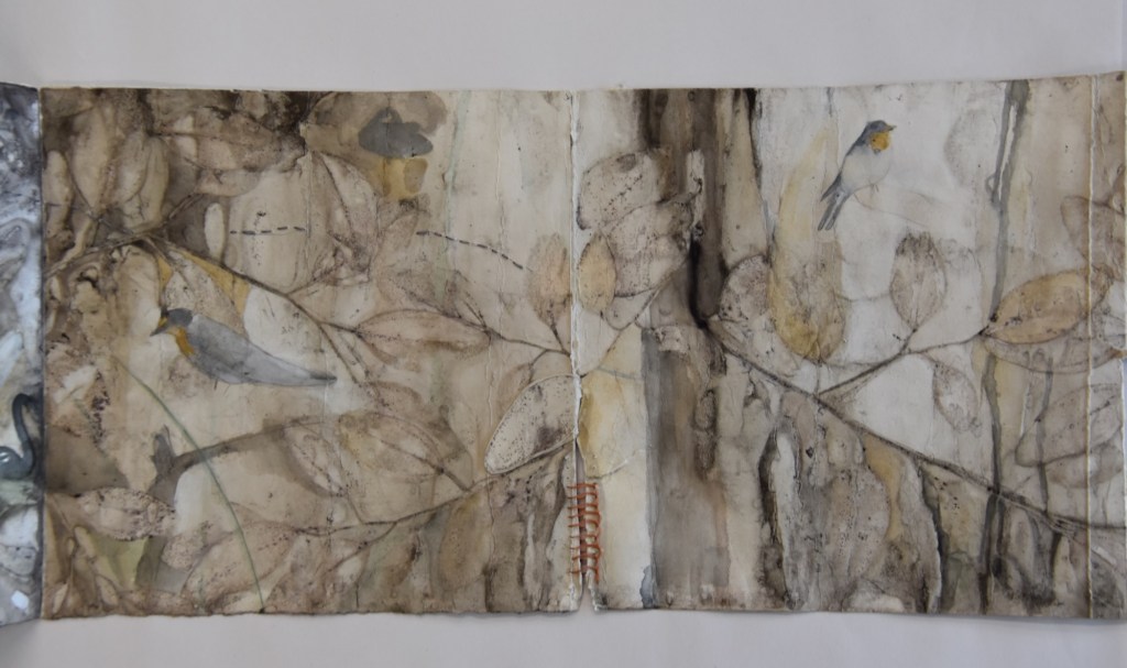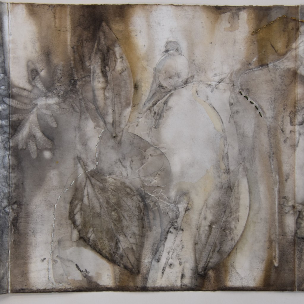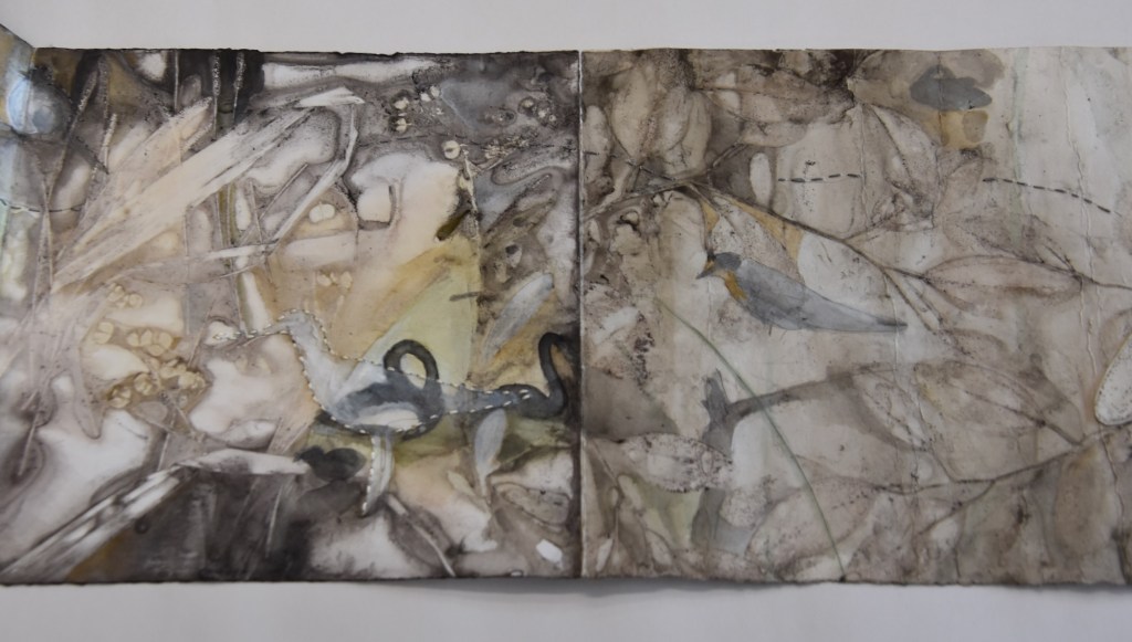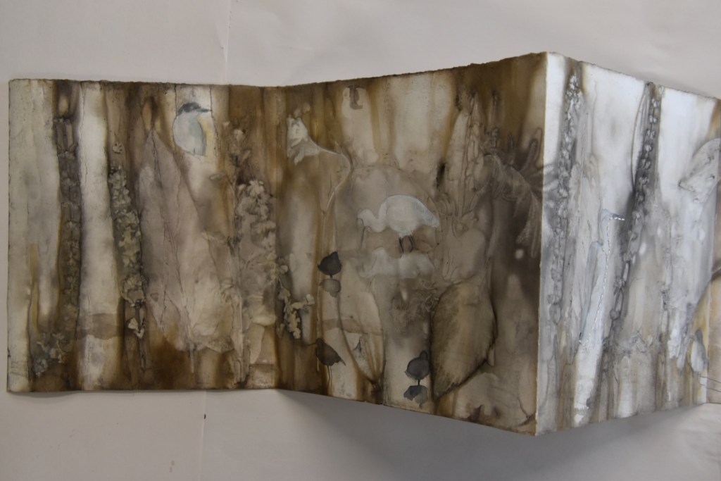 I returned to the wetlands a number of times during my long weekend stay and collected bits and pieces of plants to create this eco print on my return home. I used a heavy cartridge paper, which softened and tore a little in printing process. It’s fragility providing a metaphor for the vulnerability for a land that has been at times poorly treated. I added watercolour, images and thread to the concertina book to describe some of the journey of this beautiful environment.