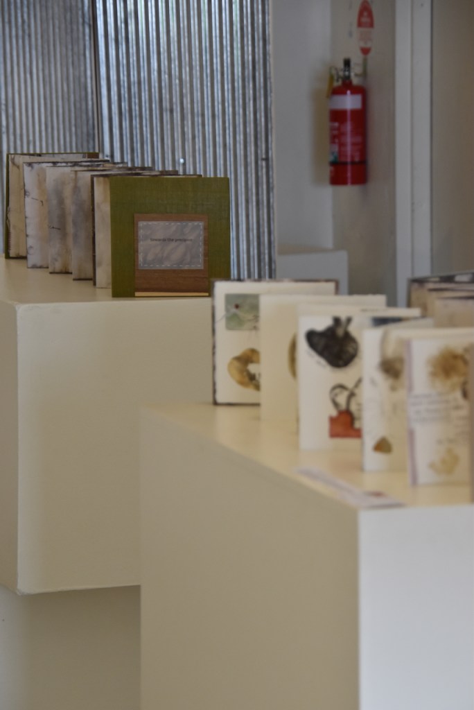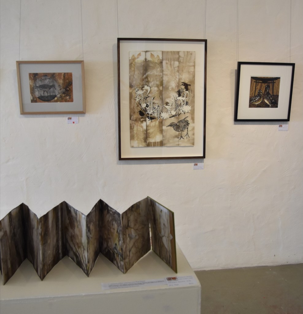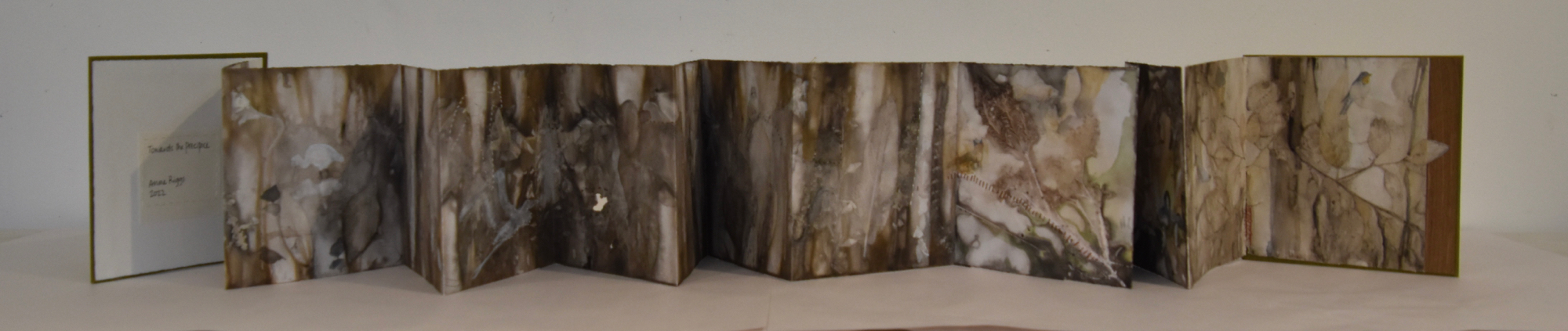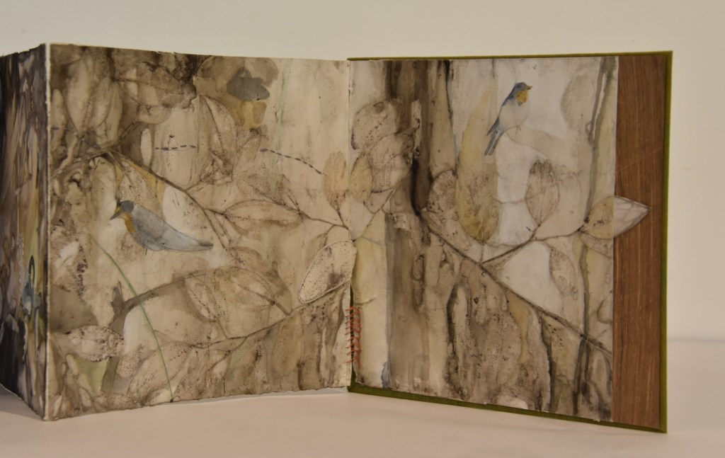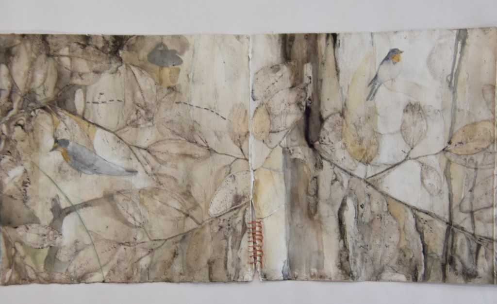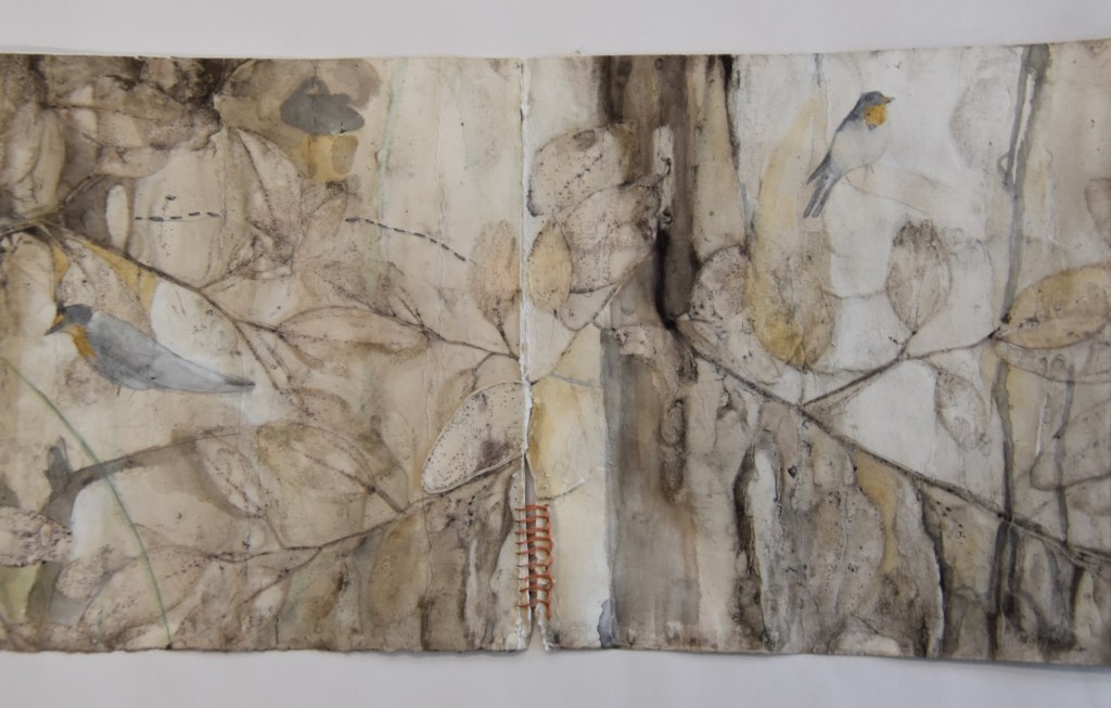 I returned to the wetlands a number of times during my long weekend stay and collected bits and pieces of plants to create this eco print on my return home. I used a heavy cartridge paper, which softened and tore a little in printing process. It’s fragility providing a metaphor for the vulnerability for a land that has been at times poorly treated. I added watercolour, images and thread to the concertina book to describe some of the journey of this beautiful environment.