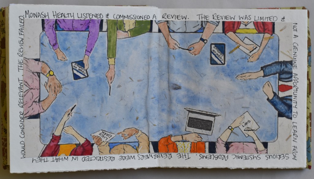 Whilst the service, and its parent, a major Melbourne public hospital, refused to engage in any form of respectful conversation addressing the pain their Carelessness was causing, a creative community formed to express their feelings in art. Our aim was to create together, to initiate ‘soul repair’, to communicate with the health providers, and for the project to be of service in other organisations where client needs can easily be overlooked.