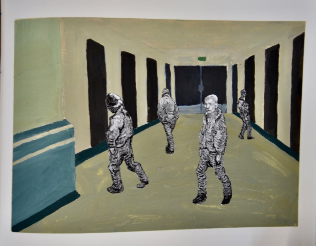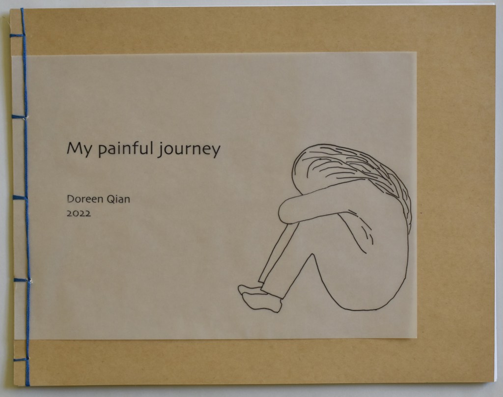 In making her book, Doreen drew inspiration from the work of Vincent Van Gogh, an artist who also suffered mental ill health. The swirling way she applied text and paint references his work, and the people in her depiction are drawn from his work Prisoners Exercising 1890 (made after a print of Newgate Prison in London by Gustav Dore). her book is bound using Japanese binding.