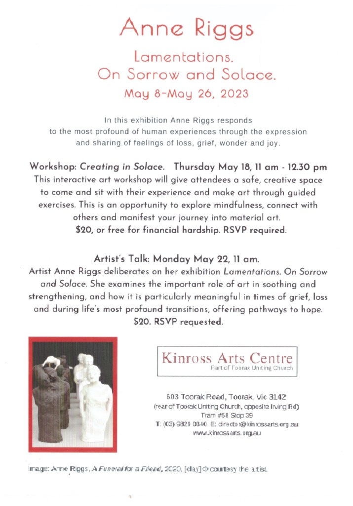 Opening Monday 8 May until Friday 26 May Lamentations : on sorrow and solace, is an exhibition bringing together new and older works to explore and contemplate mourning, and where solace can be found.