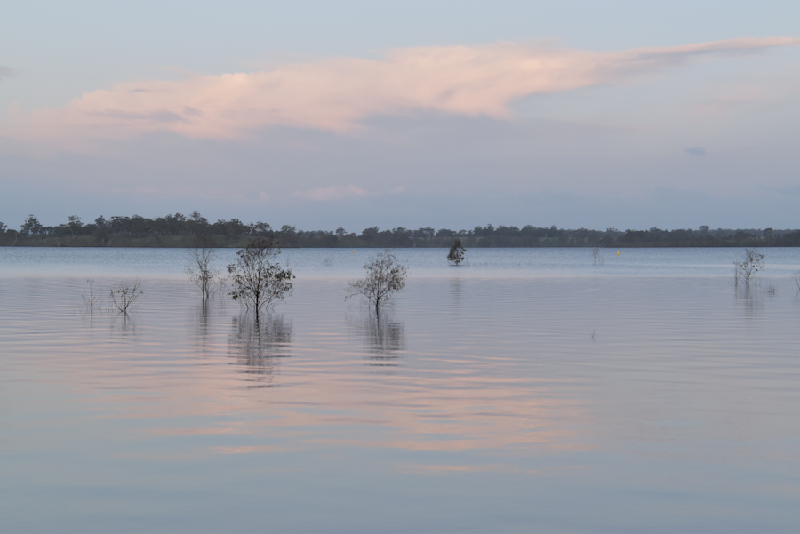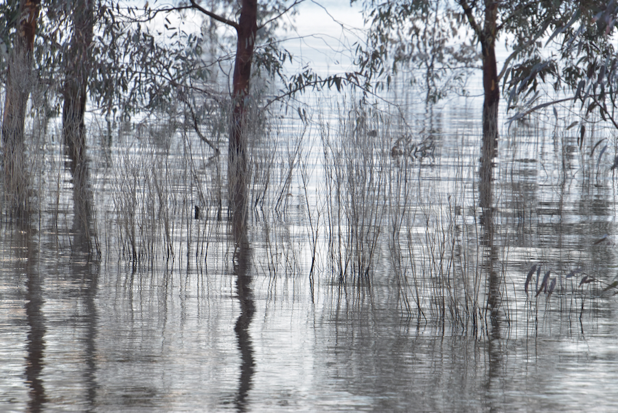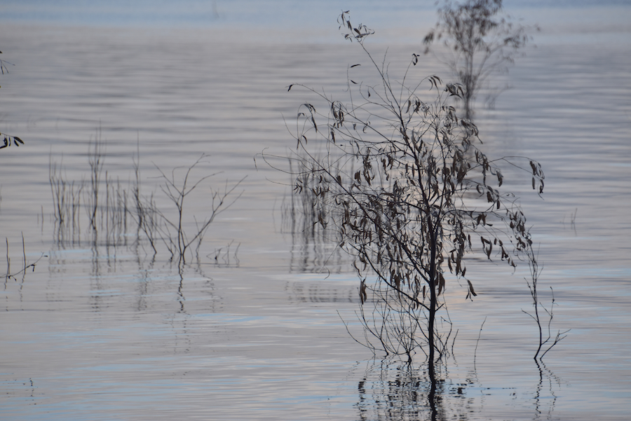My first visit to Lake Eppalock was just a few weeks ago. Strange as it is not that far from places I visit often. Lake Eppalock is a reservoir for the Campaspe region of Victoria. And just now, it is full, nearly to overflowing, and this is raising alarm bells for townships downstream who were not long ago devastated by floods. Some fellow visitors told me they had never seen the lake so full. Only a few years ago it was almost dry because of the prolonged drought, hard to believe as I looked across at the submerged fences, signs and trees, boggy paths and moss.