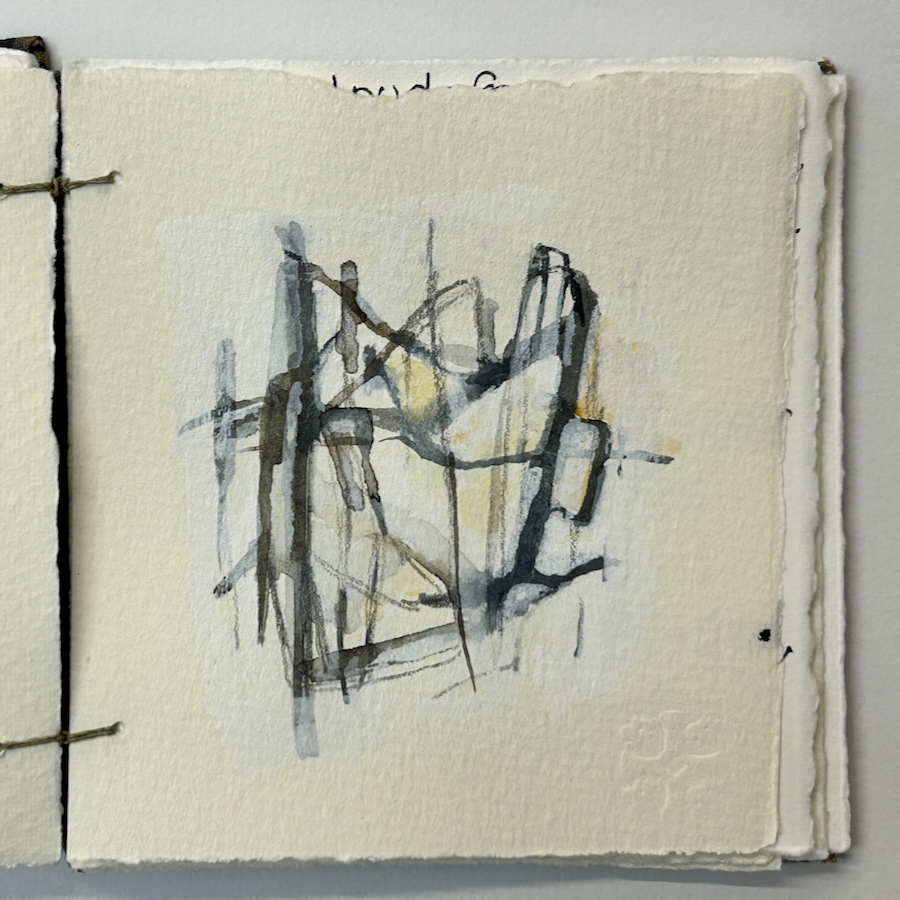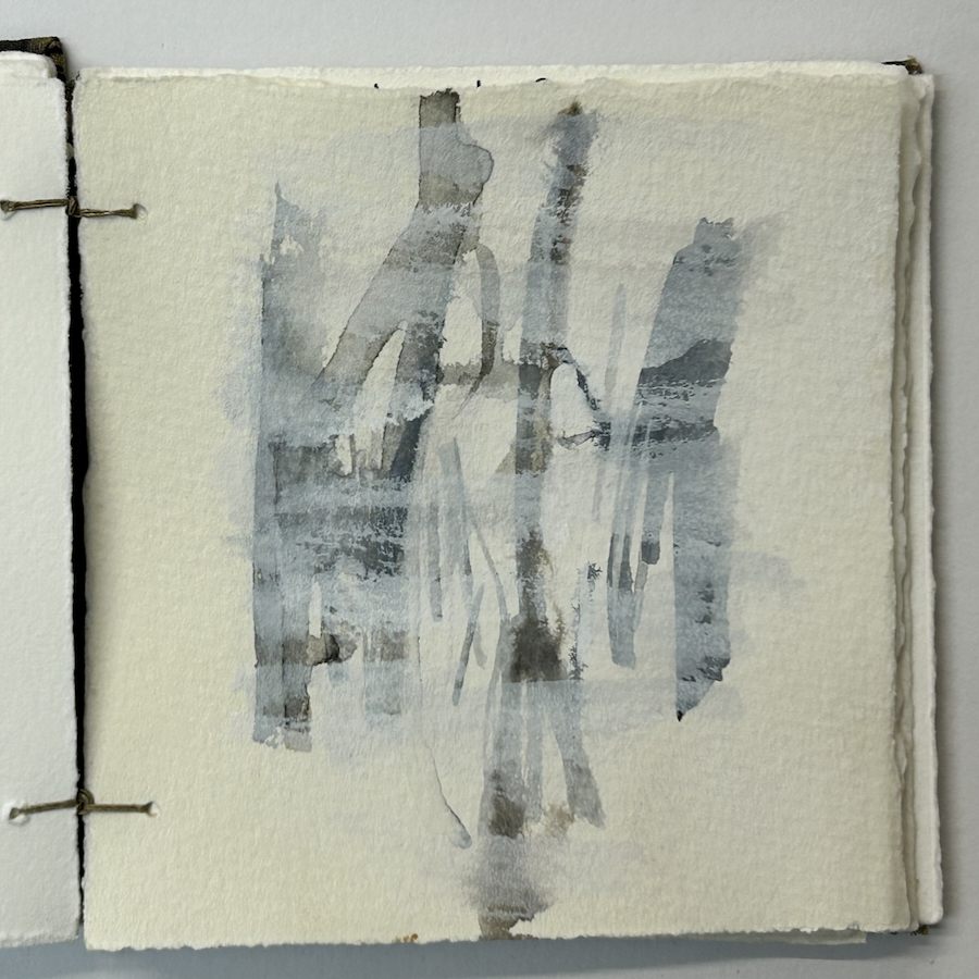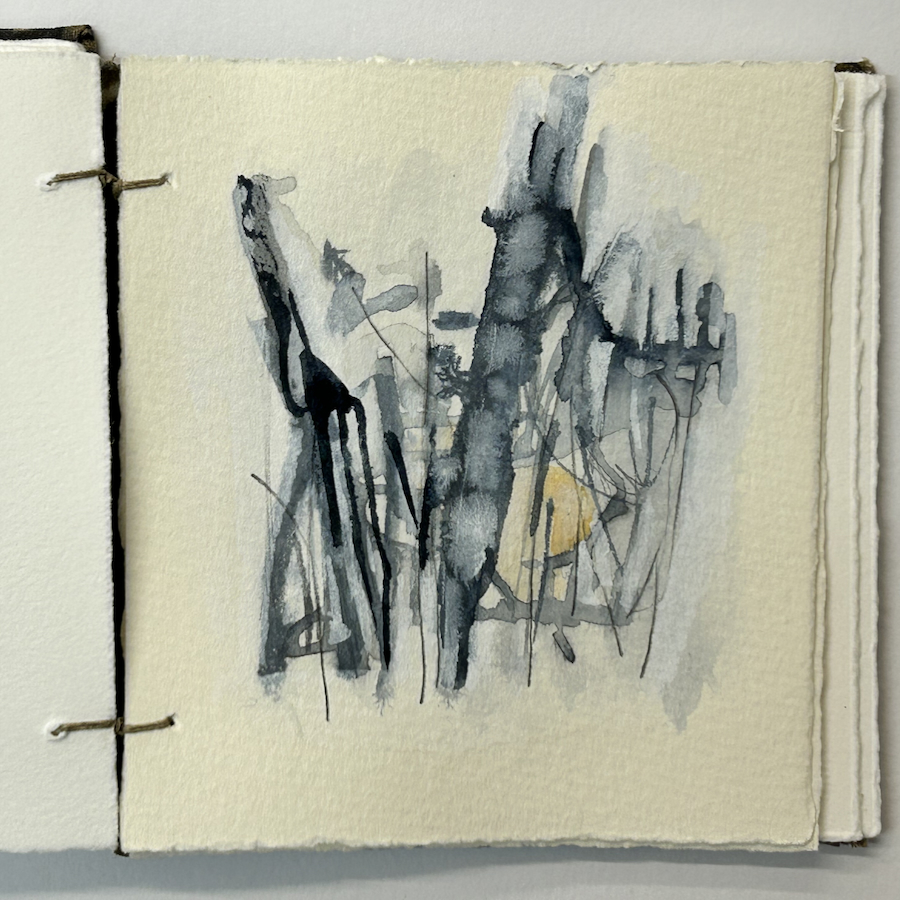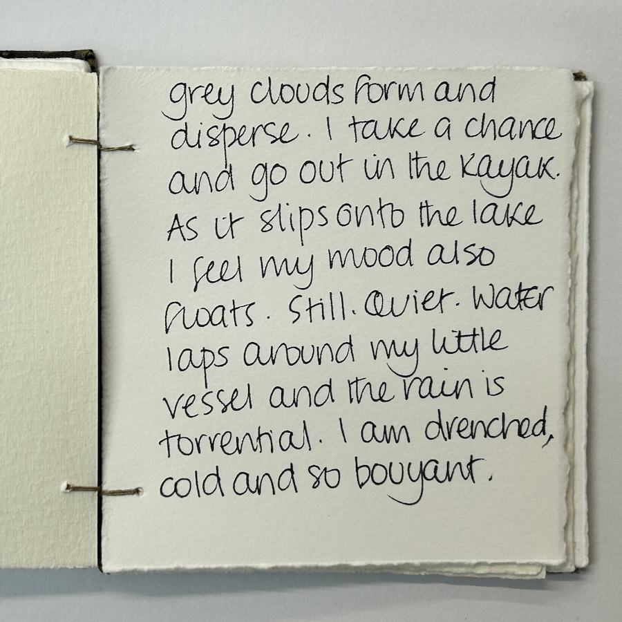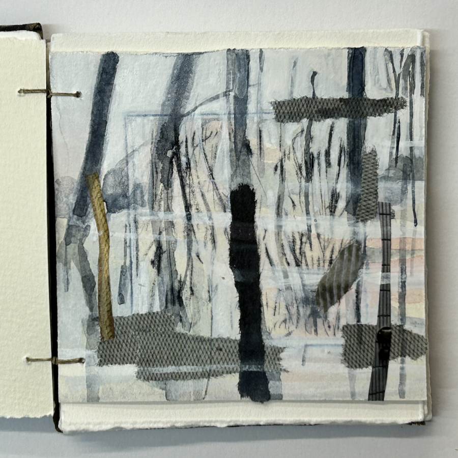 I made tiny drawings of the lake whilst I was there, and the plates when I got home. I painted over some of the prints, added collage, and printed over some small paintings I had made. Although the pages are quite abstract, they do capture something of the rain heavy skies, water filled lake, and floating around through the submerged trees and reeds.