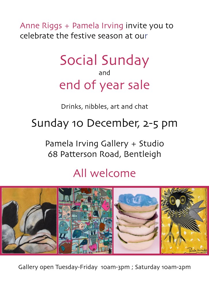 It is has been quite a year for many of us – jammed packed with highs and lows; wonders, challenges and no doubt drudgery! And here we are in December again – the start of the silly season. Pamela Irving and I are co-hosting Social Sunday, this Sunday 10 December at the Pamela Irving Studio and Gallery in Bentleigh. We think it is time for celebration, to gather people together to share a drink, food and a chat. Please join us.