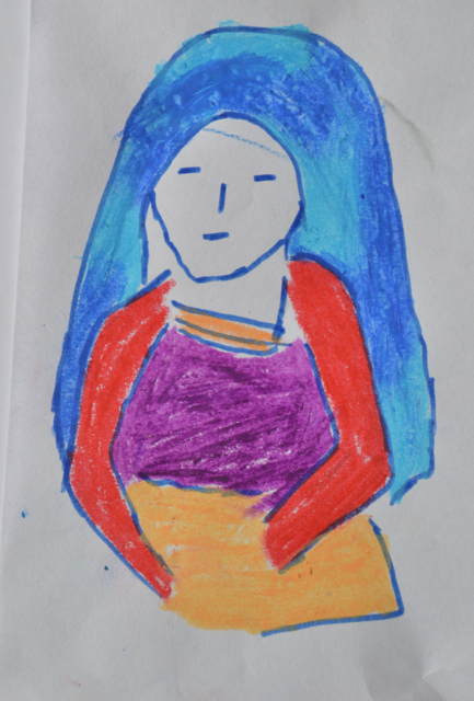 a beautiful image of a woman with shawl over her head done by Poonam, a volunteer on the program.