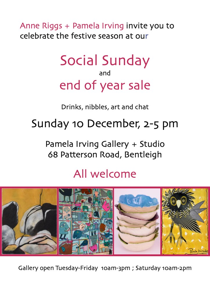 Pamela Irving Studio+Gallery, 68 Patterson Road, Bentleigh. 1 October – mid November. Open 24/7, viewed from the street.